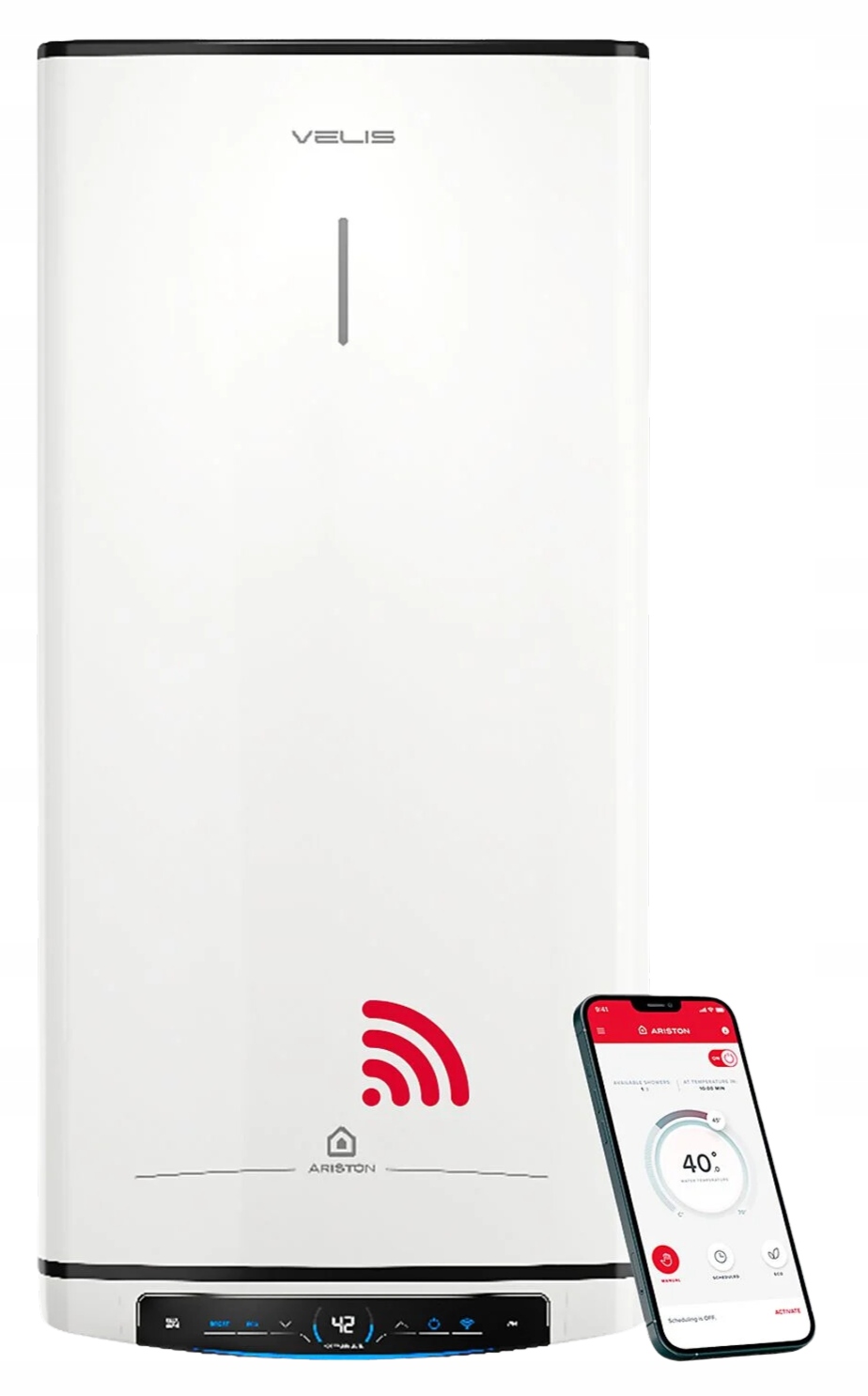 Zintegrowany moduł WiFi i aplikacja Ariston Net pozwalają na zdalne sterowanie urządzeniem, ustawienie harmonogramów oraz monitorowanie zużycia energii – wszystko z poziomu smartfona.