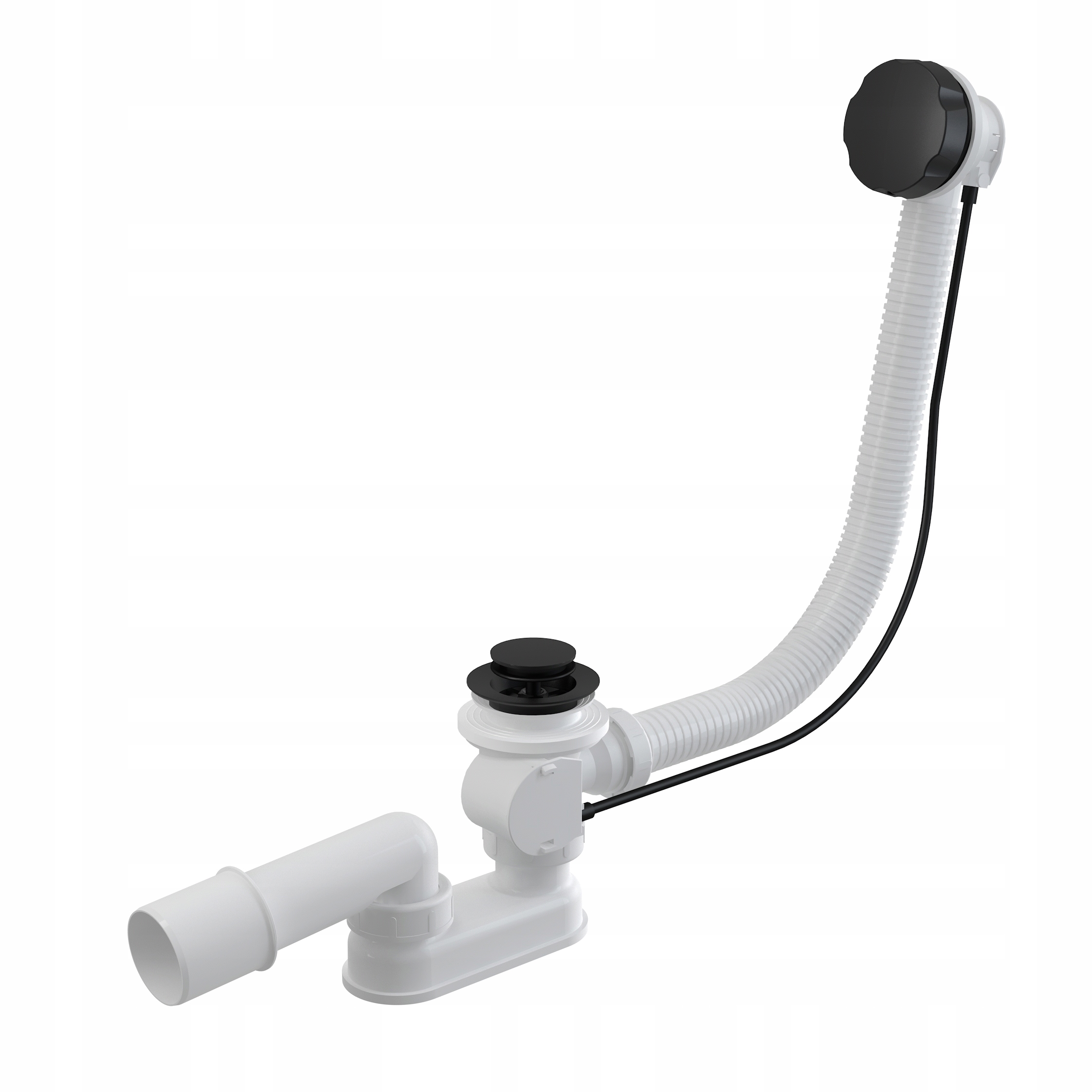 Model A55BLACK to wysokiej klasy syfon wannowy marki Alcaplast, przeznaczony do wanien o standardowym otworze wylotowym Ø52 mm. Dzięki zastosowaniu automatycznego korka sterowanego za pomocą cięgna Bowdena, użytkownik zyskuje wygodną i estetyczną kontrolę nad odpływem wody.
