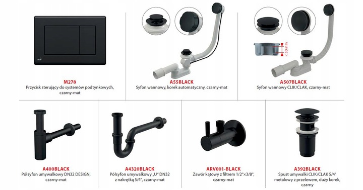 Napisz pierwszą opinię o „Czarny syfon wannowy Alcaplast A55BLACK | Ø52 mm | Pokrętło | Matowy metal”