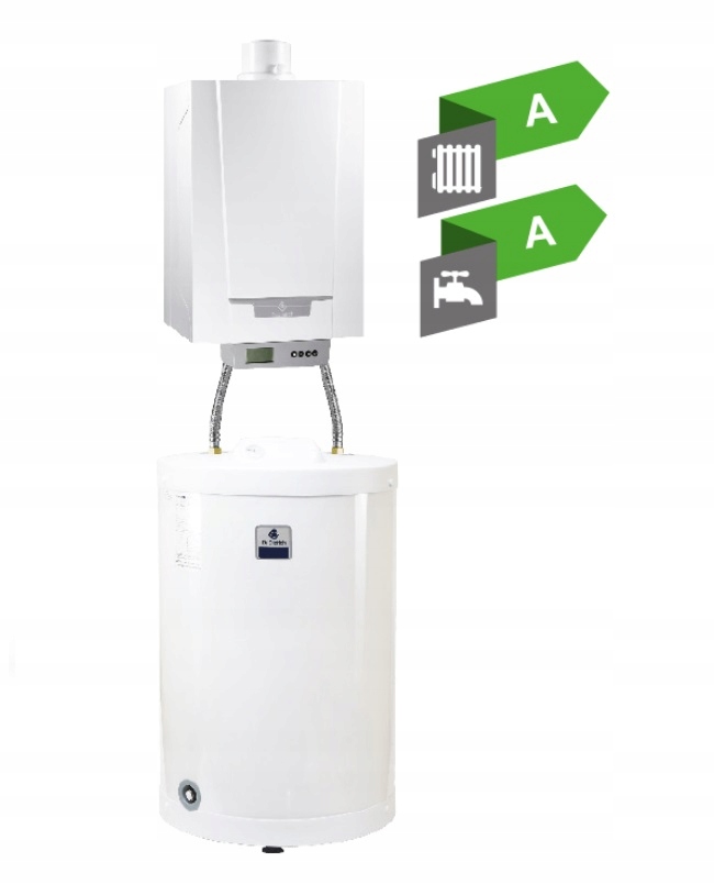 - Elastyczność montażu – kompaktowe wymiary kotła i pionowe przyłącza zasobnika