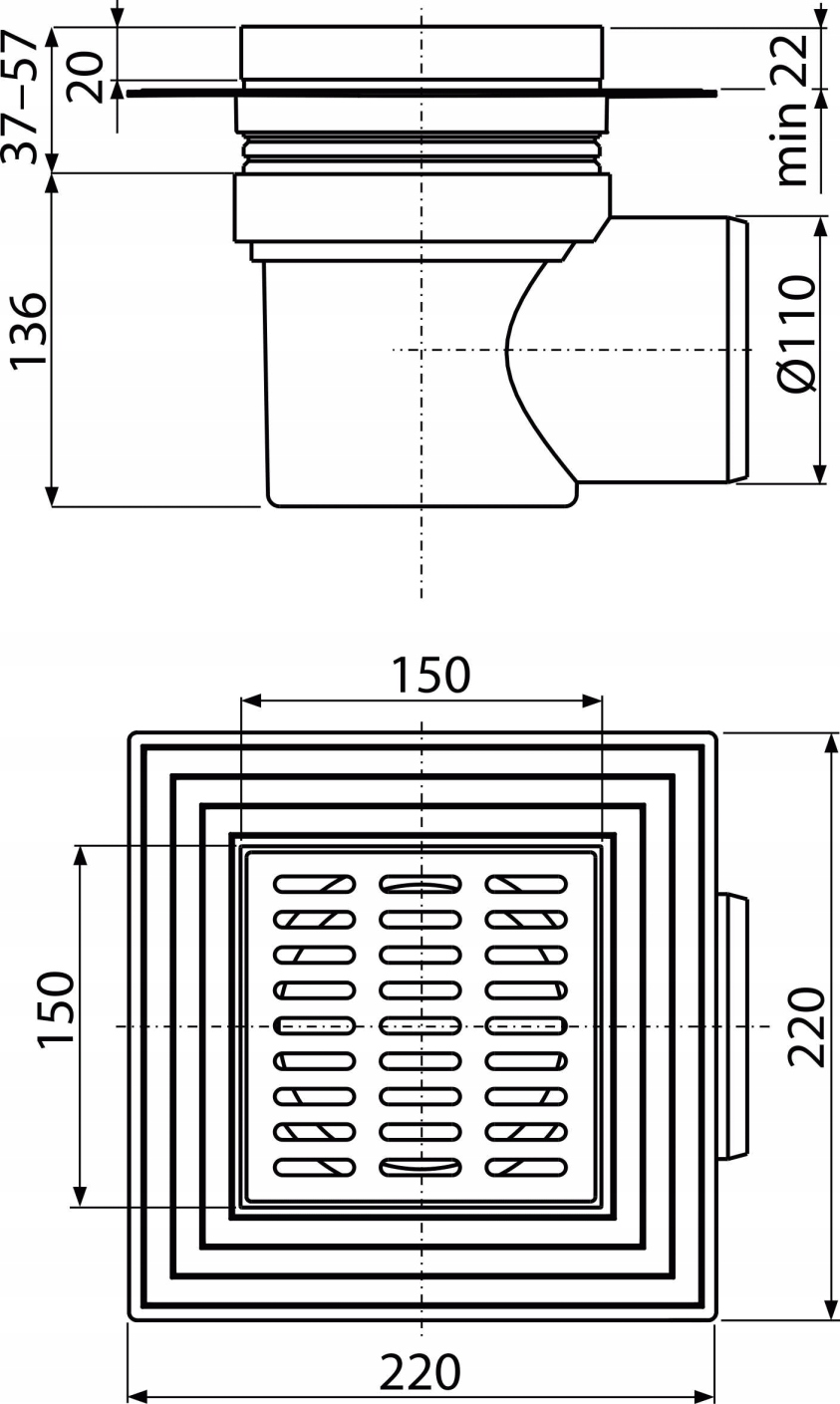 Kratka ściekowa ALCADRAIN APV10|150×150 mm|Syfon mokry|Dwa poziomy izolacji